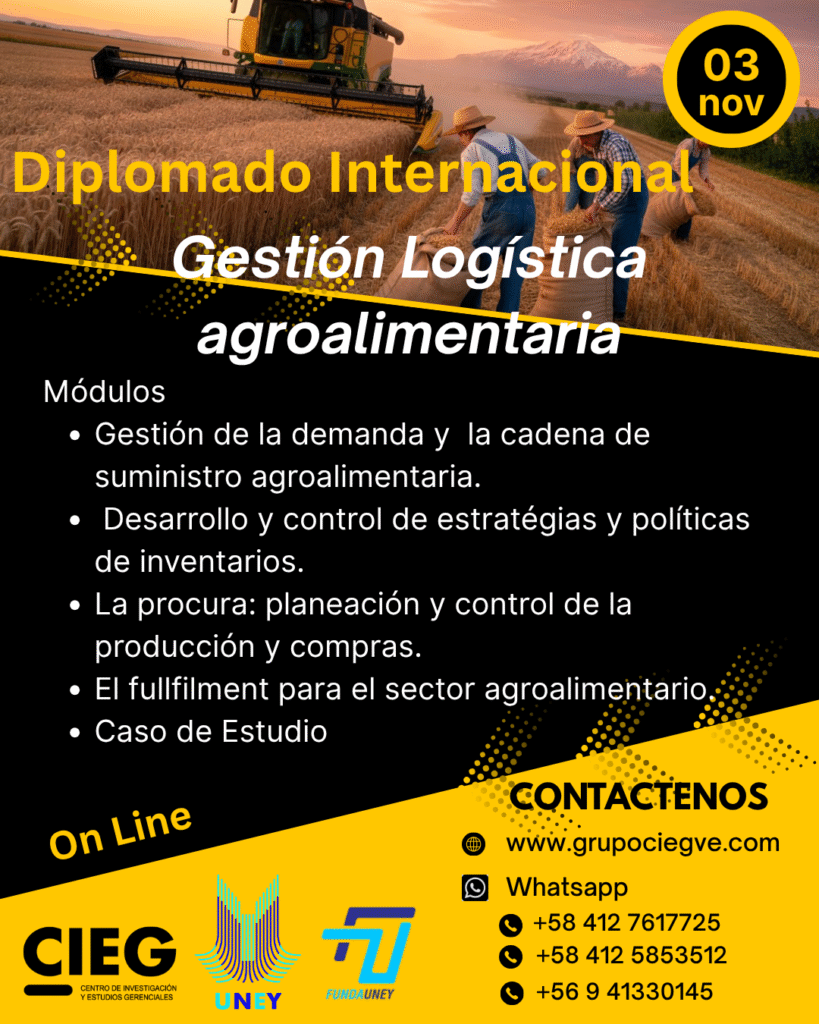 El Centro de Investigación y Estudios Gerenciales (CIEG Venezuela) en convenio con FUNDAUNEY bajo la dirección de la Universidad Nacional Experimental de Yaracuy UNEY en esta oportunidad quiere ofrecerles el diplomado GESTIÓN DE LOGÍSTICA AGROALIMENTARIA programa desarrollado con el fin de cubrir las necesidades de las organizaciones del área agroindustrial, que requieren la ejecución de los procesos logísticos y de la cadena de suministro, que les permitan mejorar significativamente la productividad y rentabilidad de los procesos en la procura de garantizar la sustentabilidad del negocio y a su vez garantizar la calidad de los productos de la granja a la mesa de sus consumidores.